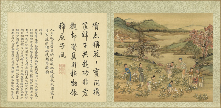 《采棉》(清乾隆《御题棉花图》绘本,台北故宫博物院藏)