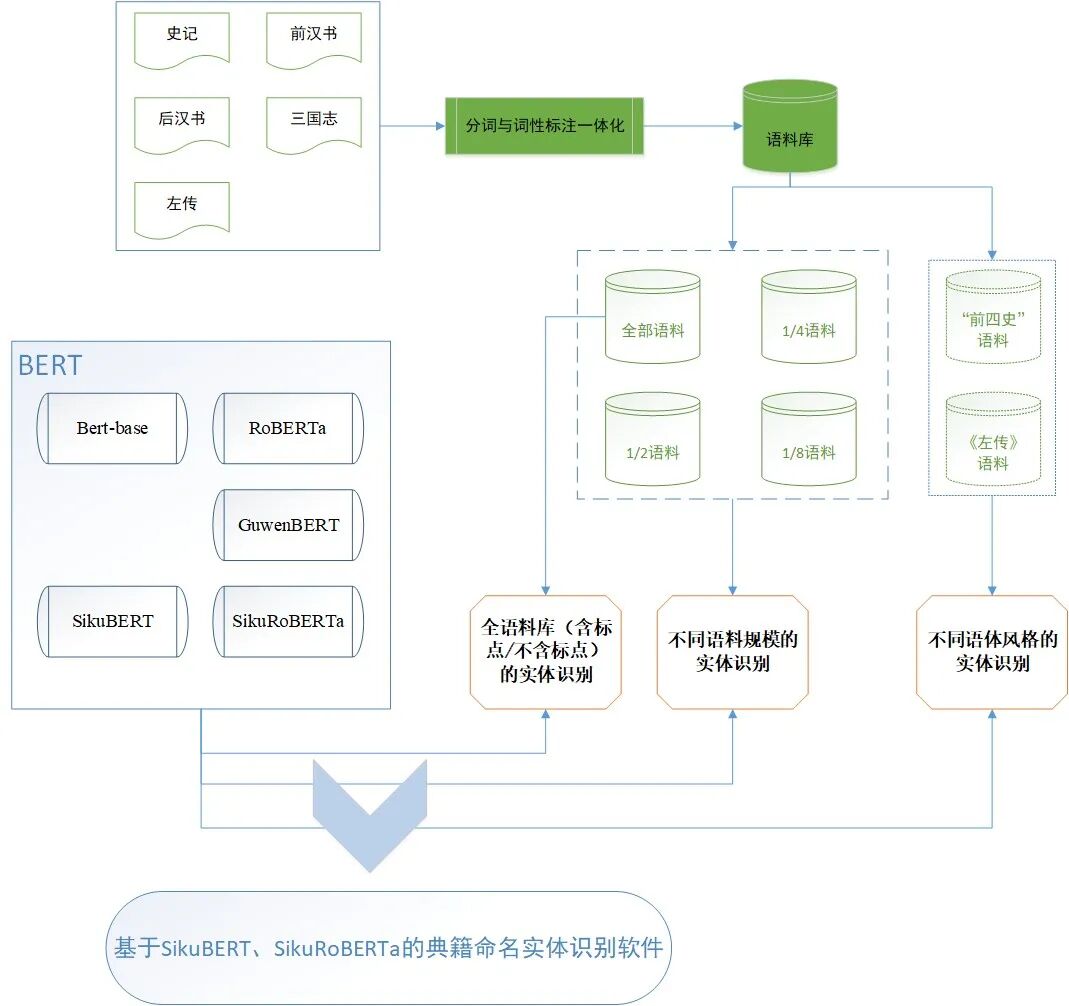 《四库全书》是我国古代最大的文化工程,完整呈现了我国古典文化的知识体系。近日由南京农业大学信息管理学院牵头,南京师范大学文学院参与,使用《四库全书》繁体版本语料分别在Bert-Base-Chinese和Chinese-RoBERTa-wwm-ext(下文简称“RoBERTa”)上进行继续训练的SikuBERT、SikuRoBERTa发布。该研究在基于《左传》语料的自动分词、词性标注、断句、命名实体识别等下游任务上作了简要验证,效果较上述3个预训练模型均有不同幅度的提升。因此,本文尝试利用Bert-base、RoBERTa、GuwenBERT、SikuBERT、SikuRoBERTa等BERT预训练模型,以《左传》《史记》《汉书》《后汉书》《三国志》等为实验语料,对人名、地名、时间词等3种历史事件的主要构成实体进行识别,进一步探究SikuBERT、SikuRoBERTa在不同典籍、不同规模、不同语体风格语料上的泛化能力并作可能的改进尝试。