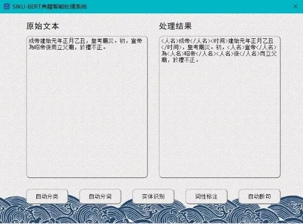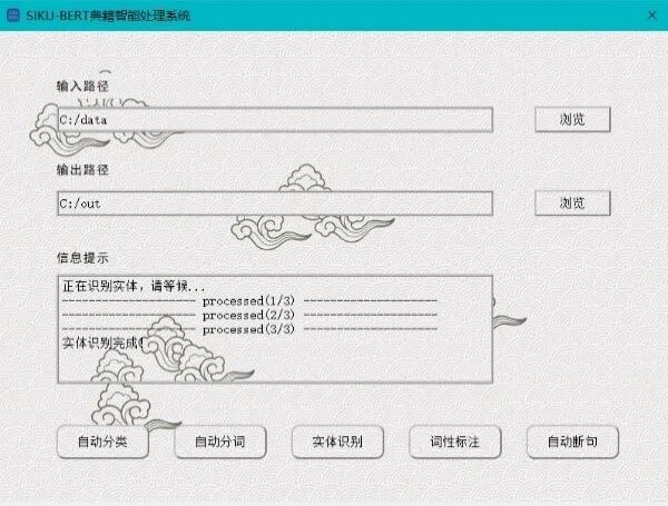 本实验构建了一个基于SikuBERT、SikuRoBERTa的命名实体识别应用系统,集成了分词、词性标注、断句、实体抽取、自动标点等常见古籍智能信息处理功能。该系统旨在帮助古籍研究学者更好地快速了解典籍,以推动研究的深化。具有两种语料输入模式:单文本模式和语料库模式,如图3所示。单文本模式可以即时输入和处理文本,语料库模式能对多个语料文件进行识别。SIKU-BERT典籍智能处理系统可以识别人名、地名和时间3类经典实体。
