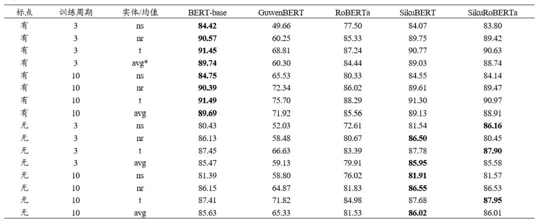 本文在BERT-base、Chinese-RoBERTa-wwm-txt、GuwenBERT、SikuBERT、SikuRoBERTa上进行了测试。实验分别在含标点、去标点、不同规模单文献、不同语体风格语料上进行了测试。