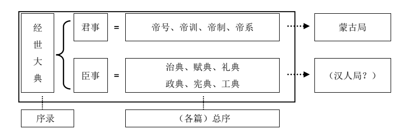 这段话一再检讨纂修者的不称职,甚至用了“贪冒恩私”这样字眼,显见文宗的不满和虞集的“惊惧”。[56]又说目前只是“粗立其纲”、“以待增修”,导致序录不像是全书正式颁行时的序言,而更像是一份工作汇报。它特意点出君事四篇为“蒙古局治之”应该也有厘清责任的意思。至顺三年欧阳玄的《进经世大典表》就只说“仿《周礼》之六官,作皇朝之大典”,[57]全篇无一字提及君事与蒙古局之事,更证明奎章阁的汉儒只能主导臣事六篇的修纂。