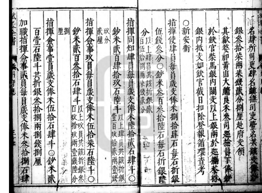 徽州府及境内新安卫文武官员的俸禄,也分为本色和折色两项,均折银发放,前者称俸米银(简称俸银),后者称钞米银(简称钞银)。不过在具体记述时,除县级官员分别记载了俸银和钞银的数额之外,其他官员均只提供了俸银和钞银的合计数额。《徽州府赋役全书》对于新安卫各职位武官的俸给,分别说明了本色俸和折色俸的石数及其折银价,经与江西卫所相比,相同职位武官的本色俸和折色俸的数额完全相同,折价则是本色俸每石0.53两,折色俸每石0.06两。该书并未说明徽州府文职官员本色俸和折色俸的石数,但于府总部分说明各县官吏俸给系“每石征银柒钱”【22】。经计算,每石0.7两系文职官员的俸银折价,钞银折价文、武官员均是每石0.06两。