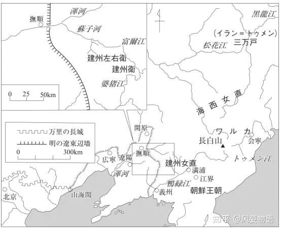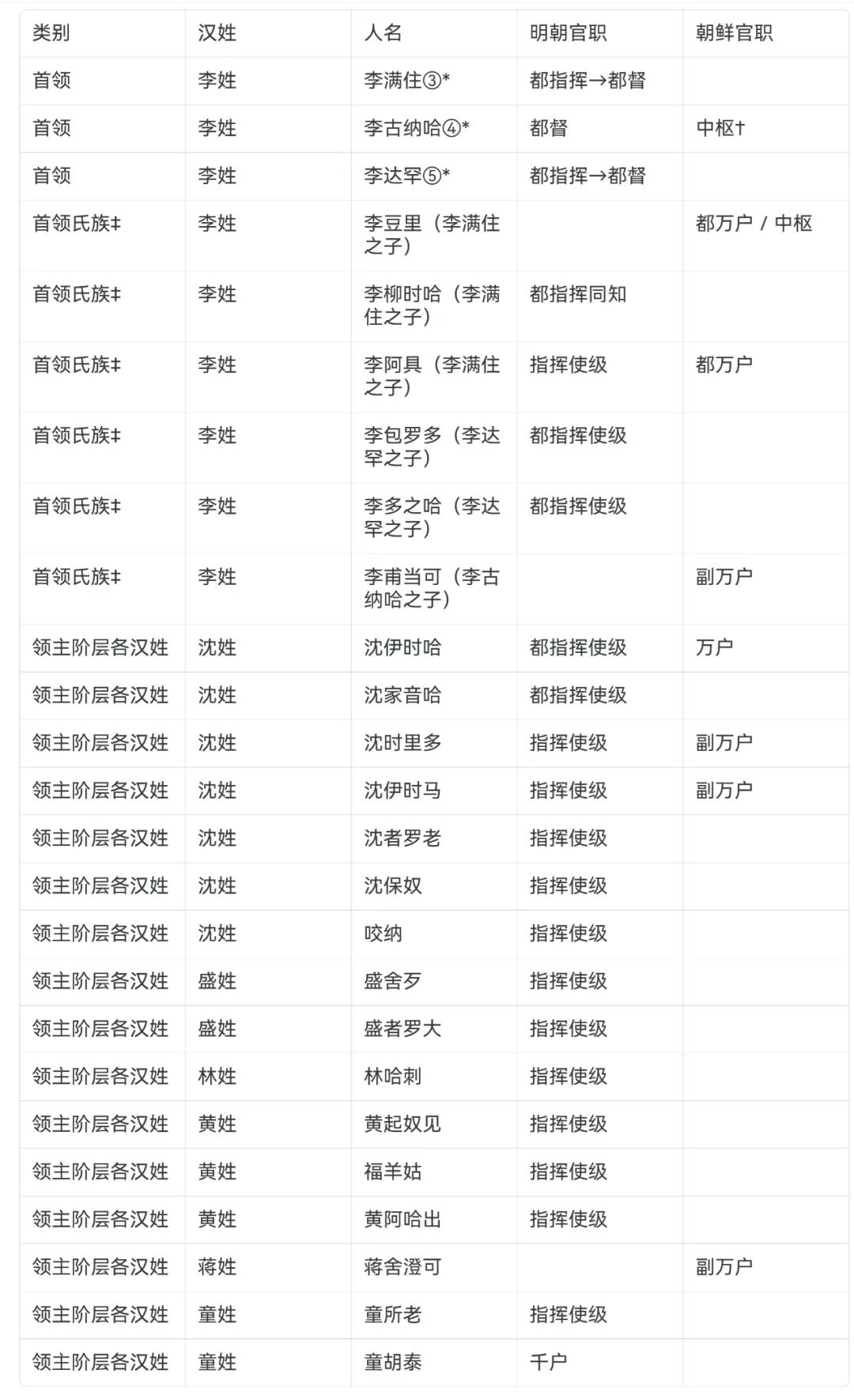 建州女真是 14 世纪后半叶至 16 世纪活跃于东北亚地区的通古斯系狩猎农耕民族(女真族的一支)[1],17 世纪时,该族群统一了全体女真族,更名为 “满洲”,并建立了大清(清朝)。有观点指出,清朝具有作为蒙古帝国继承国家的性质 [冈田 1992:228-231 页]。为何由通古斯系建州女真建立的帝国会具备这样的性质?要解答这一问题,必须将作为清朝形成基础的建州女真,置于欧亚大陆东部 “后蒙古时代”[2] 的背景下,视其为这一时代崛起的势力,并在该时代特征的框架内考察建州女真的集团结构。 与女真族类似、居住在森林地带的通古斯系狩猎农耕民族,虽被认为与草原地带的突厥 – 蒙古系骑马游牧民族拥有相似的社会组织,但其历史上的集团结构形态仍存在诸多未解之处。建州女真这一集团,是趁着元明战争的混乱,从黑龙江、东流松花江下游向南迁徙至图们江、鸭绿江流域后形成的。建州女真以小型集团的形式分散割据于长白山地森林地带的河谷区域,一方面通过商业性狩猎与采集毛皮、人参等森林产品开展贸易,另一方面也在河谷与盆地从事旱田农耕。在清朝建立之前,他们并未形成明确的国家形态,因此常被当作 “异民族” 或 “北方民族” 的一支而受到边缘化对待。尽管学界曾对清朝建立前的集团迁徙轨迹[3]以及与相邻的朝鲜王朝(以下简称 “朝鲜”)的交涉与关系史[4]有所探讨,但关注建州女真自身内部集团结构的视角却十分薄弱。 建州女真大致可分为三个集团(即 “建州三卫”),其源头均可追溯至元朝(13-14 世纪)统治时期设于松花江下游地区的三万户府(蒙古语 “万户”,即 “秃满”):其一为源自胡里改万户府的建州卫,另外两个则是源自斡朵里万户府的建州左卫与建州右卫。由于清朝太祖努尔哈赤出身于斡朵里部[5],后两个集团自古以来便备受关注;而建州卫因在与努尔哈赤的对抗中战败并被吞并,关于其内部构成的研究相对稀少。然而,在努尔哈赤崛起之前(15-16 世纪中叶)的建州女真中,占据核心地位的集团正是建州卫。本文旨在通过厘清建州卫的集团结构,进而阐明东北亚通古斯系集团的历史集团结构。 1403 年,万户阿哈出率领的胡里改集团归顺明朝,被名义上授予 “建州卫” 的称号,阿哈出一族还被赐予 “李” 姓。此后,该家族世代担任建州卫集团的首领,阿哈出之孙李满住率领建州卫集团,定居于鸭绿江支流(婆猪江,今浑江)流域[6]。此后,建州卫与斡朵里部(建州左卫、右卫)汇合,成为建州三卫整体的盟主,并号称 “大金”[7]。阿哈出一族(李姓,即完颜氏)在此后两百年间,始终以建州卫集团(完颜部)首领家族的身份,在鸭绿江地区居于统治地位 [8];即便进入清代以后,该家族的后裔仍作为八旗中的实力派旗人得以存续 [增井 1997]。 【地图】15 世纪东北亚大陆部分(出处)根据 [杉山清彦 2015] 卷首图 A 制作 以上是目前已知的建州卫集团概况,但其中仍存在尚未解决的问题:建州卫集团的统治阶层究竟具有怎样的构成?建州女真的组织形态为 “联盟体”,在统领各卫的首领之下,分布着若干中小领主阶层[9],这些领主各自通过地缘与血缘关系聚集数十至一百数十名属民。那么,在建州卫集团中,这类中小领主阶层究竟由哪些人构成? 在 1599 年满洲文字创制之前,女真人并未留下自身的史料。因此,对解决这一问题有帮助的资料主要是外部史料,尤其是 15 世纪与建州女真存在密切交流的朝鲜的记录。《朝鲜王朝实录》(以下简称《朝鲜实录》)中记载了丰富的建州女真人物信息,特别是以汉字书写的姓氏(即 “汉姓”)。例如,在建州左卫与右卫中,可见 “童”“马”“浪” 等汉姓,其中 “童” 姓对应女真族父系亲属组织(氏族)“哈拉” 中的觉罗(gioro)氏,“马” 姓对应马佳(magiya)氏,“浪” 姓对应钮祜禄(niohuru)氏 [三田村 1960][金九镇 1983][增井 1998](注:上述满洲语名称均采用穆麟德式转写规则由满洲文转写为罗马字母,下文同)。尽管这类 “哈拉” 作为亲属组织,其团体属性已不复存在,但作为标识父系出身及与之相关的先天身份、门第的姓氏,仍在社会中发挥着作用[10]。清代官方编纂的族谱集《八旗满洲氏族通谱》(以下简称《通谱》)等清代史料中,并未记载曾存在过此类汉姓。由此可见,《朝鲜实录》中出现的汉姓,是理解同一时代建州女真集团构成的极为珍贵的信息。 关于建州左卫与右卫,学界已知的情况是:在元朝统治时期担任斡朵里万户的童姓猛哥帖木儿一族,世代世袭首领之位,此外,前文提及的马姓、浪姓以及佟姓等势力雄厚的姓氏族群,共同构成了辅佐力量 [三田村 1960][增井 1998]。另一方面,尽管建州卫是当时建州女真中的核心集团,但除了产生首领的李姓(完颜氏)之外,其领主阶层的具体构成仍不明确。《通谱》中仅记载了从被认为是建州卫所在地的 “完颜地方” 归顺的实力派人物,且均为完颜氏成员,仿佛建州卫集团的统治阶层全为完颜氏。然而,建州卫是在努尔哈赤统一建州的战争中战败,最终被吞并、解体的集团。因此,不能将《通谱》这类清代官方史料所记载的建州卫集团构成,直接当作准确信息全盘接受。 本文为探明建州卫集团的内部构成,并未采用清代史料,而是聚焦于作为同时代史料的《朝鲜实录》中出现的建州卫人物的各类汉姓,对建州卫集团的内部结构展开分析。当然,受史料限制,无法涵盖建州卫集团中可确认的所有汉