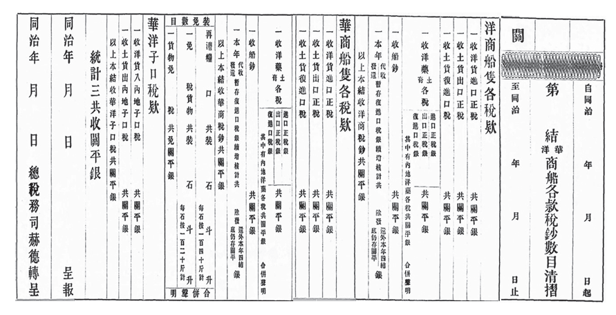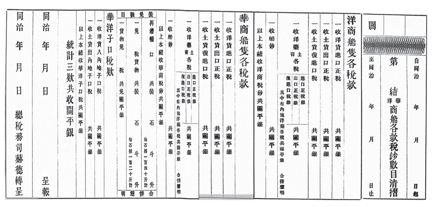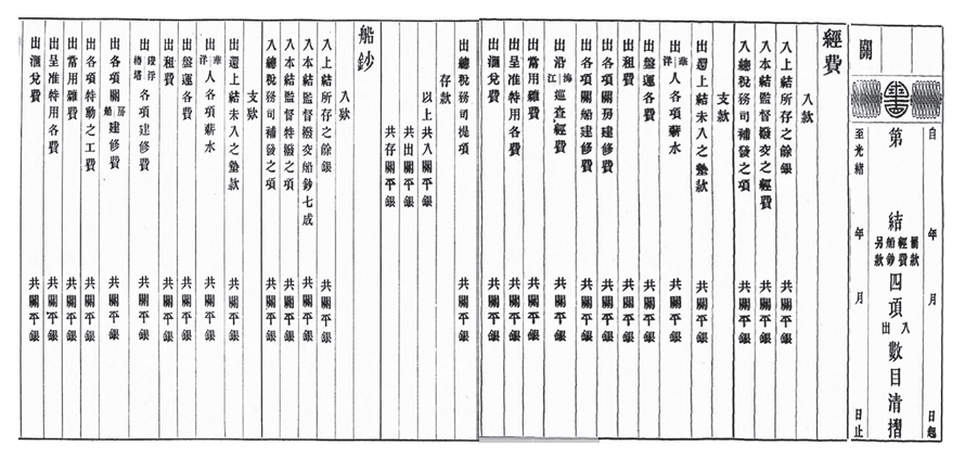 海关总署按照收支两条线的预算年报表制度进行报表制作,这是海关基本的财政运行做法。与海关收入、支出项目有关的内容包括:(1)华、洋商船各税款,华洋子口税款,其中,长江各口岸和沿海各口岸有不一样的做法。(2)各项银两账目。白银国际价格下降所带来的外汇变化,一定会影响贸易关系,进而影响海关财政。因为海关财政计量的单位以银为主,但是海关的运作和计算都是以金或者英镑为单位。因此,外汇变化对海关财政一定有影响,在贸易关系一样的情况下,如果发生了外汇变化,海关财政量的大小也会发生变化。(3)罚款、经费、船钞、另款等四项入、出数目。