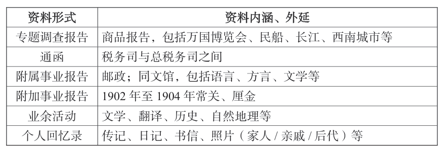 海关的主要部门之一是总税务司署,上海统计处的资料有通令和贸易统计,人事处有《新关提名录》,记录的是海关人员的薪水。对于薪水的研究也是海关研究中很重要的一部分。二是征税部,内班包括海关贸易报告、市场调查、气象报告、水位调查和医疗报告;外班包括沿海航线、河流和港口管理,这些运作都需要财源的支撑;除此之外还有沿海警戒。三是船钞部和海事部(1909年开始),从财政来说,船钞部占了很大一部分财政开支,包括营造处、理船厅以及灯塔处三个部分的费用。从日本的资料来看,日本在建立灯塔上花费了很大的费用,尽管我还未发现中国灯塔建造的具体费用是多少,但是以日本的灯塔费用来比较的话,中国在建造灯塔上应该也发生了大量的财政支出。四是教育部,同文馆的财源主要是清朝财政,但是海关同时提供了一部分教室和其他教学设施,因此海关也承担了一部分同文馆运作需要的支出。五是邮政部,在1896年建立清朝邮政之前,1884年海关已经建立了部分邮政。海关通过邮政能够取得一部分收入。对于海关而言,邮政不仅有海关通信和民间业务,还帮助扩大外汇或者汇兑的业务。之后会介绍邮政和外汇问题对海关的影响。这是我提供的海关资料(见表2)。从海关资料来看财政问题,目前最强调的资料形式是通令(Circular)。所以,我现在介绍的资料都是从通令资料里拿过来的,这些资料反映了海关财政的项目和运作,以及海关财政的变迁。最后还有个人有关的资料,包括洋员自传、洋员妻子、后人撰写的亲人回忆录和学者撰写的传记等。例如玛丽·蒂芬(Mary Tiffen)考证了家族史,讲述了母亲家族三代女性侨居中国,并成为大清帝国海关总税务司赫德的挚友的经历,向我们展现了一个由商人、外交人员、海关洋员和学者组成的在华外国人网络,从侧面反映出近代中国,尤其是沿海通商口岸的政治变迁和社会面貌。也就是从个人的材料,特别是业余活动里的材料,还有个人回忆录里也可以找到关于清朝海关财政的记载。