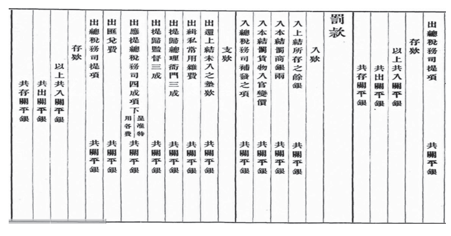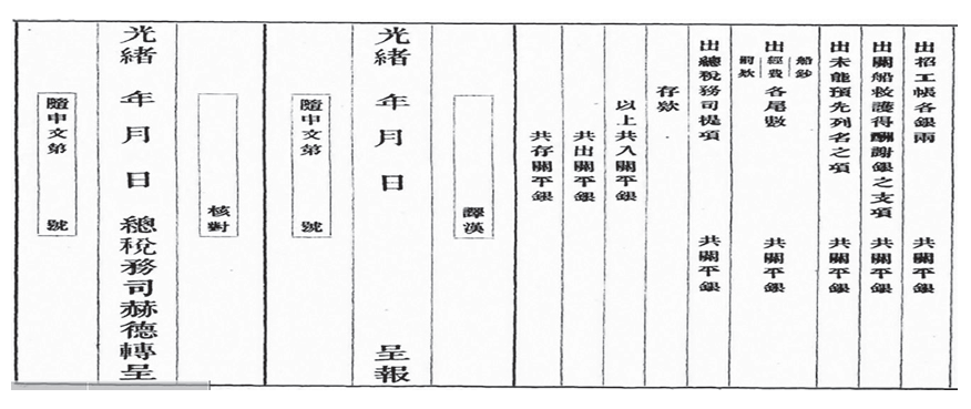 清朝海关监督关于关税的收支每年、每季有四柱清册,统计表上的各项指标概括了四柱清册中的主要内容,即旧管、新收、开除、实在四大项。有少数临时发生无法填入表中的项目,则以附注的办法摘录,所有资料在抄录后都经过校对。这是清朝正式梳理档案,并由海关监督的做法。