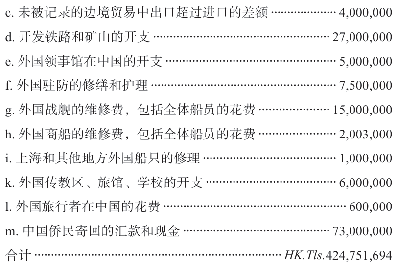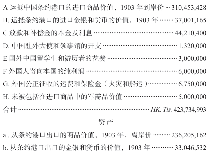 由于甲午战争之后入超急剧增加这一客观事实,马士任海关统计局长后要通过中国的对外贸易关系来明确测定贸易收支。为谋求收支上的平衡,外国借款及赔款占了负债额的第二位。在负债栏目下,含有最大不确定因素的科目是F项外国人的纯利润,在这个科目中,马士对在中国的外国人(企业),是没有区分居住和非居住而放在一起统计的,这在资产项目变动部分本来是应该考虑的。在关于F项的说明中,马士将香港地区作为“本质上的中国商业的一个构成部分”加入了国际收支计算。但是,在其他地方例如1903年的贸易报告中又有“香港地区从内地吸收了100万海关两的币材”这样的记载,这又在统计上把香港地区区别对待了。所以究竟把香港地区经济视为清朝经济的一部分,还是把它除外呢?马士在这两者之间不断地摇摆,以至于对香港地区作了两种处理。正如他所说,在国民经济当中,对于这些实际存在着的地方经济上的诸如此类问题,确实也有视野受限制的问题。同时马士特别注意了外国工程收的佣费和保险金,并将这部分保险费用放在一个国际守则的很重要的项目里。这也表示在19世纪末到20世纪初,也就是清末时期发生的比较大的世界市场的变化,对马士的想法带来了一些影响。