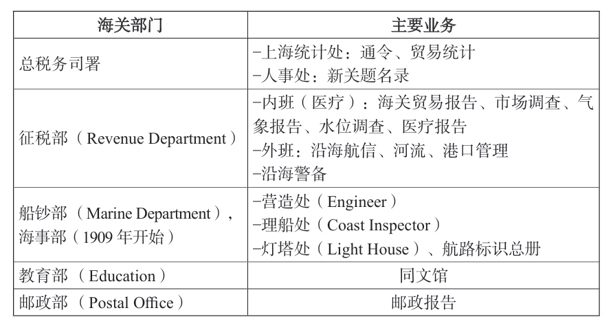 在这个三角关系里,收税和借款之间也存在着矛盾的一面。收税是为了增加海关的财源,和借款的目的看起来是一致的,但是收税和增加财源不一定是直接的因果关系。马士提出的财政收支平衡问题,也是从扩大经济活动或者发展对外关系的角度对财政收支进行一个综合性的理解。马士提出了财政收支平衡的试办方案,把侨批大量的数字也放进财政收支中,对于马士提出的财政平衡的方案我会在后文进行简短的介绍。我们不难发现,对以贸易统计为主的海关材料进行研究,会影响三角关系的平衡。这三个部分中的每个部分都有自己的个体问题,今天我们将三个部分联系起来讨论。接下来我们从海关各部门及其主要业务看海关资料。