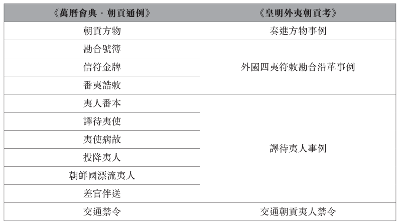 《皇明外夷朝貢》只有上、下兩卷,宗數卷秩上殊別於《正德會典》卷96至102,共七卷篇幅的「禮部主客司」,以至《萬曆會典》卷105至113。所以表一的「《皇明外夷朝貢考》與《諸司職掌》、《大明會典》編目比較表」呈現出不同的編排佈局。