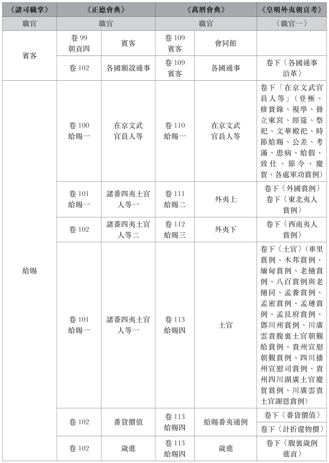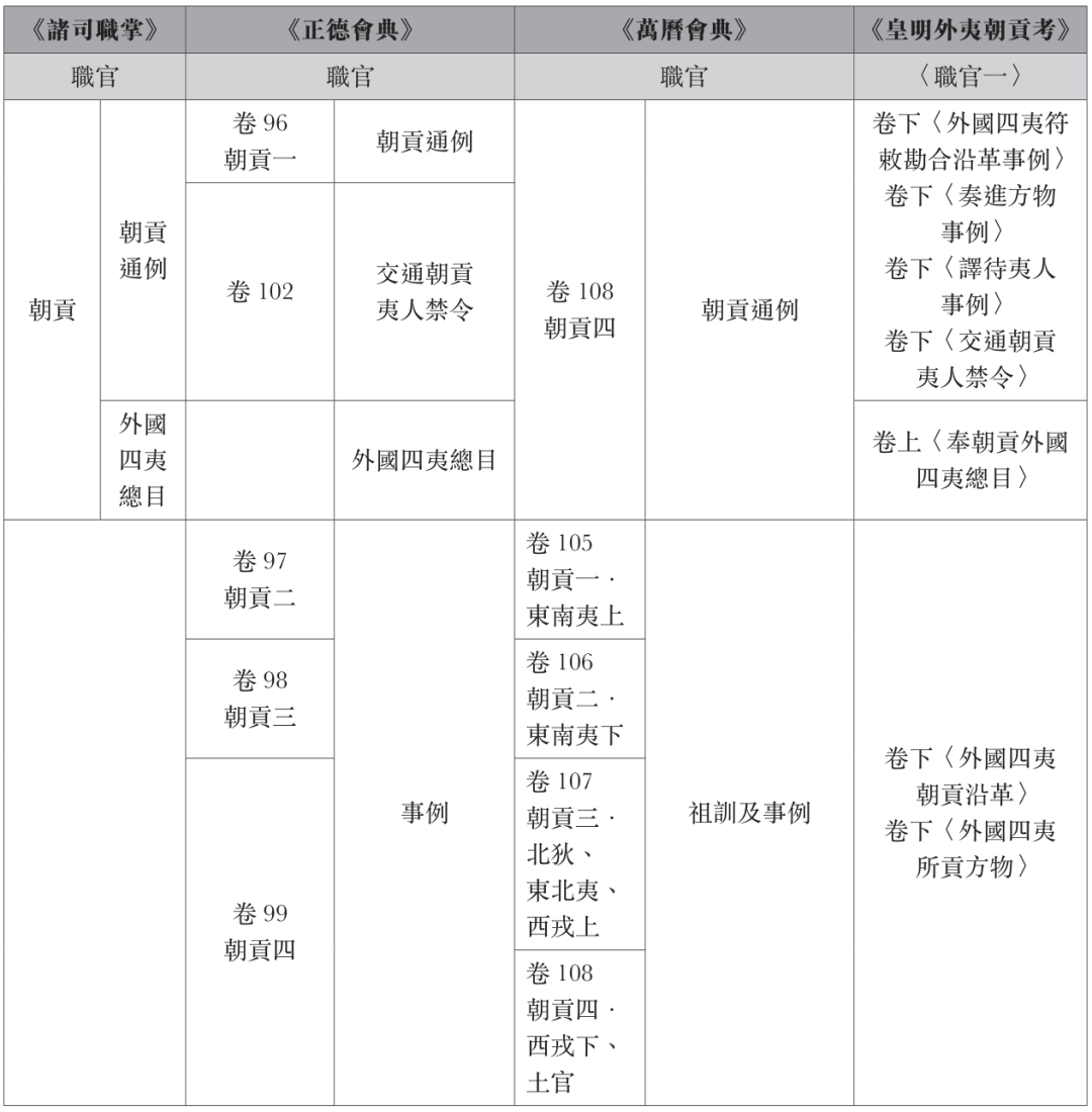 至於卷97〈朝貢二〉、卷98〈朝貢三〉、卷99〈朝貢四〉與卷100〈給賜一.在京文武官員人等〉、卷101〈給賜一.諸番四夷土官人等一〉、卷102〈諸番四夷土官人等二〉、卷102〈番貨價值〉、卷102〈各國額設通事〉、卷102〈交通朝貢夷人禁令〉、卷102〈歲進〉才是《正德會典》新增的「事有相關者」。但值得注意的是,這些新增內容在編排上仍是附於「朝貢」與「給賜」類目,可見《正德會典》的「朝貢論述」架構是源自於《諸司職掌》,而其後《萬曆會典》也延續「職官」、「朝貢」、「賓客」與「給賜」的模式。換言之,《諸司職掌》可謂是奠定了明代政典「朝貢論述」的框架。從表一可見,《皇明外夷朝貢考》雖然條目編排不同,但卻不曾超出這一範圍。