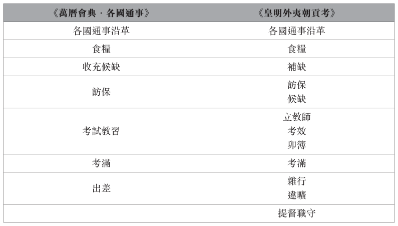 因此,接下來將從《皇明外夷朝貢考》當中(一)與《萬曆會典》相近而《正德會典》所無的內容,以及(二)正德、萬曆《大明會典》皆無的條目內容作分析。
