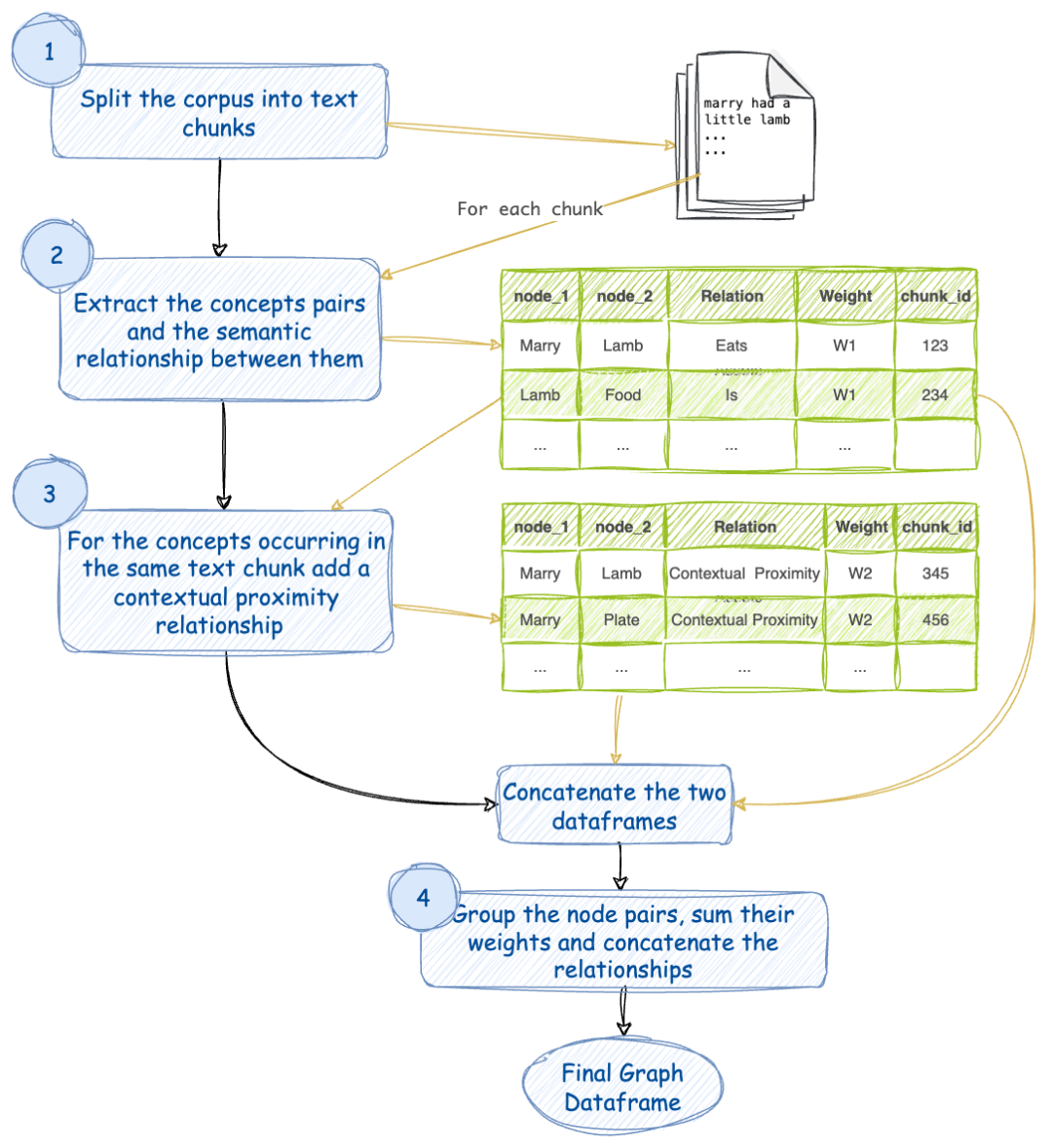 将文本语料库拆分为多个文本块,并为每个文本块分配一个唯一的 chunk_id。2.提取概念及其语义关系