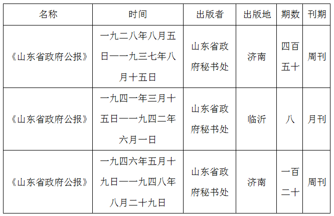 表一 国民党政府《山东省政府公报》沿革概况一览表