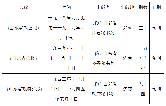 山东沦陷期间,日军在山东扶植伪政权,一九三八年三月五日成立了伪山东省公署,设秘书处,并设秘书长一人。秘书长综理伪省公署公文,“承省长之命复核各厅呈判之稿件并对于各厅事件以本处便函或登通知簿分别行之”。一九三八年九月上旬伪山东省公署在山东东阿刊出《山东省政公报》,其后经过两次更名,于一九四五年五月十日停刊,共出刊二百四十一期(详见表二)